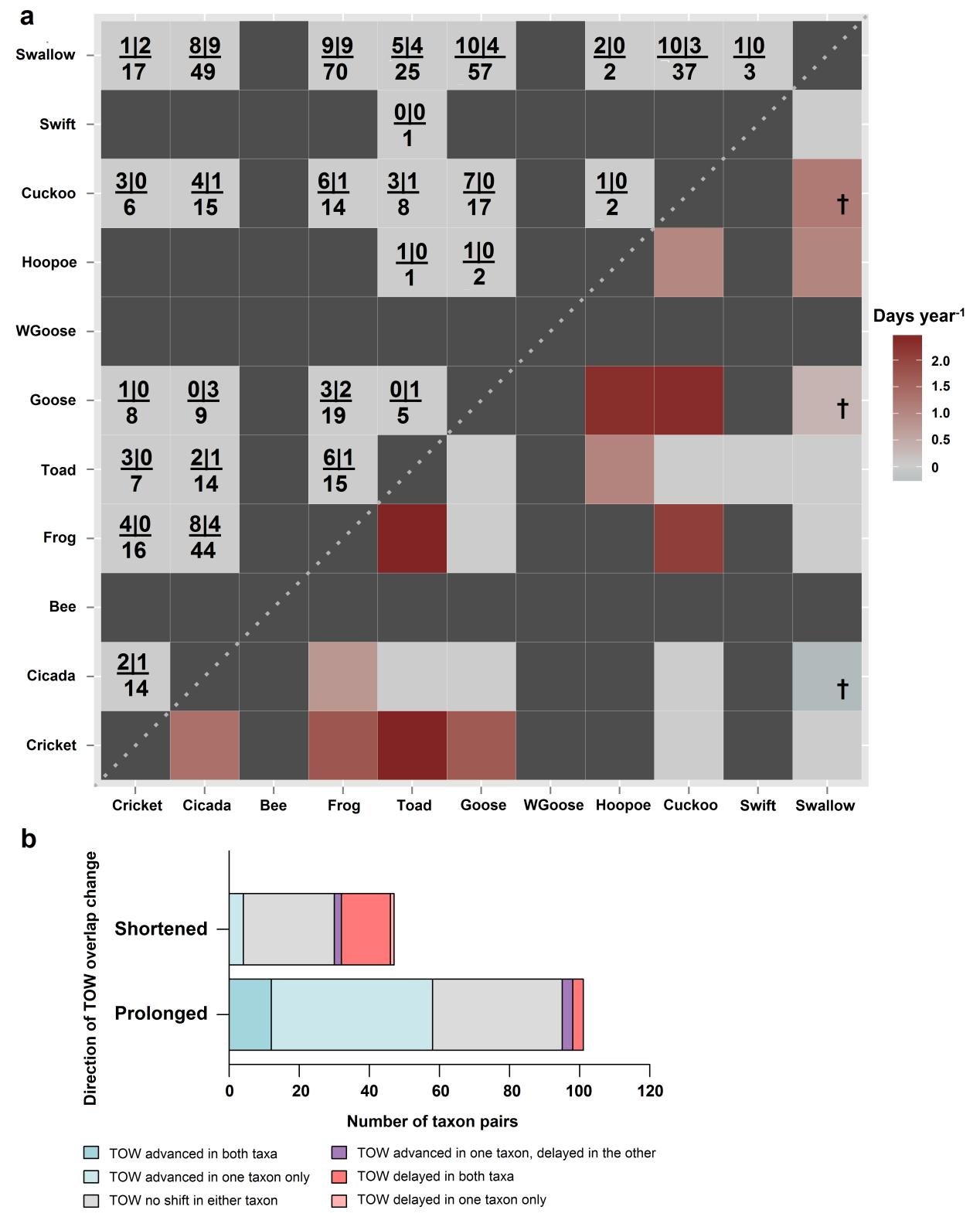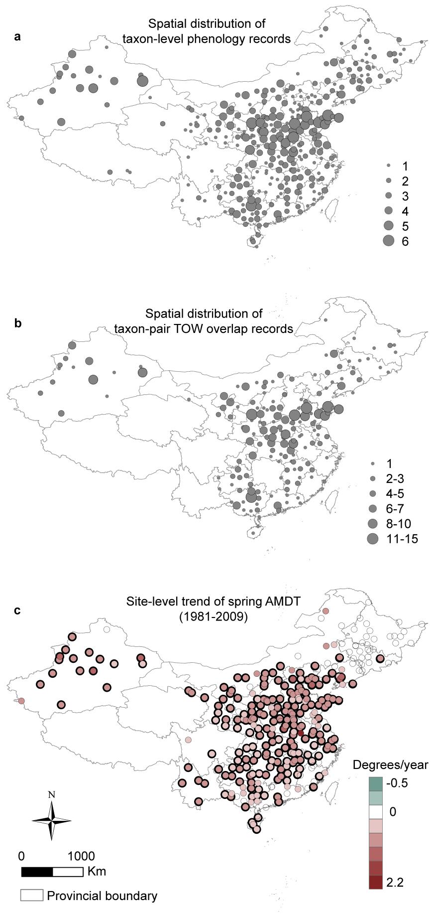 中国科学院成都生物研究所进化与保育研究团队胡军华青年研究员与来自中山大学、中国科学院大气物理研究所、中国国家气象局、美国普林斯顿大学、华盛顿大学、海南师范大学以及北京师范大学的科研人员开展合作研究。他们基于覆盖中国的329个气象站所提供的各动物类群在群落水平上的出现时间及时间跨度信息,分析了气候变化对1981-2009年动物物候的影响。该研究涉及11个动物类群,包含两栖类、昆虫、鸟类等。这项研究的结果表明:气候变化与类群间的时间重叠跨度在群落水平的增加相关。该研究强调了被严重忽略但可能重要的时间途径。通过时间途径气候变化能影响群落集合,并可能已经导致比通常估计更少的物候耦合。更为重要的是即使在同步的物候变化下,类群之间时间维度重叠程度的改变可能持续。该研究对于探讨气候变化所导致的生态后果具有重要的指示意义。