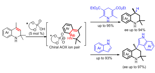 中国科学院成都生物所李光勋副研究员及唐卓研究员设计了一类特殊的合成方法,用于快速得到AOX中间体。通过在二氢奎宁(DHQ)的芳香环上引入供电子基团,使得其双健具有较高的电子云密度,能被普通的质子酸质子化形成具有较高活性的AOX中间体,该中间体能被HEH还原,或者与吲哚发生Freidel-Craft反应,快速得到相应的四氢喹啉。同时,用手性磷酸催化能形成相应的离子对,快速合成手性四氢喹啉。