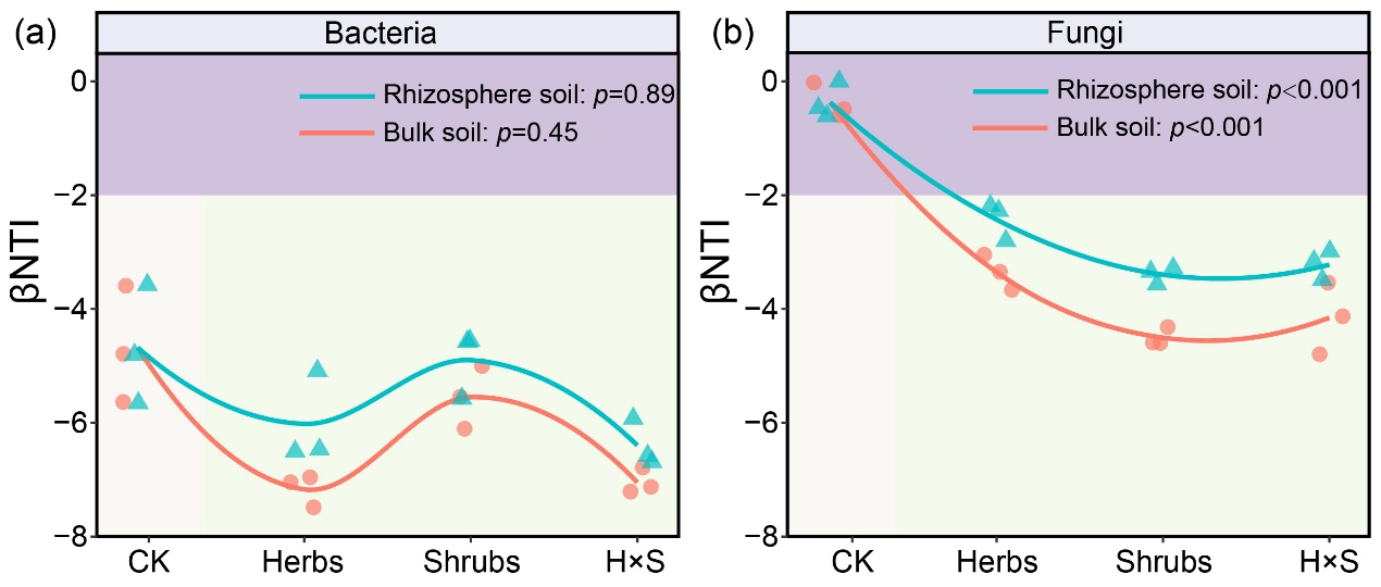 针对上述问题,中国科学院成都生物研究所退化土壤生态功能恢复创新团队博士研究生李瑞轩在庞学勇研究员指导下,综合运用高通量测序、生态零模型、PICRUSt2 功能预测与FUNGuild 真菌功能群分析等手段,系统解析了高寒裸露边坡在生态恢复过程中土壤细菌与真菌群落的构建机制。研究发现:(1)在所有处理(包括未修复裸露边坡及不同植被恢复模式)中,细菌群落的βNTI值均低于-2,表明其构建始终由确定性过程主导。(2)裸露边坡中真菌群落的βNTI值介于-2与+2之间,显示其构建以随机过程为主;而在生态修复后,βNTI值降至-2以下,说明真菌群落构建由随机漂变转向确定性选择。(3)非根际土壤中细菌与真菌群落的|βNTI|值均高于根际土壤,反映出非根际生境中环境选择压力更强。该研究进一步指出,植物引入驱动的资源输入增强了系统发育聚类,提升了土壤多功能性,且细菌的生态位宽度与碳氮循环功能密切相关。研究结果不仅揭示了高寒边坡生态恢复过程中细菌与真菌群落构建的不同路径,也凸显了细菌在早期恢复阶段的关键作用,并为今后制定兼顾微生物多样性与功能联系的生态恢复策略提供了理论依据。