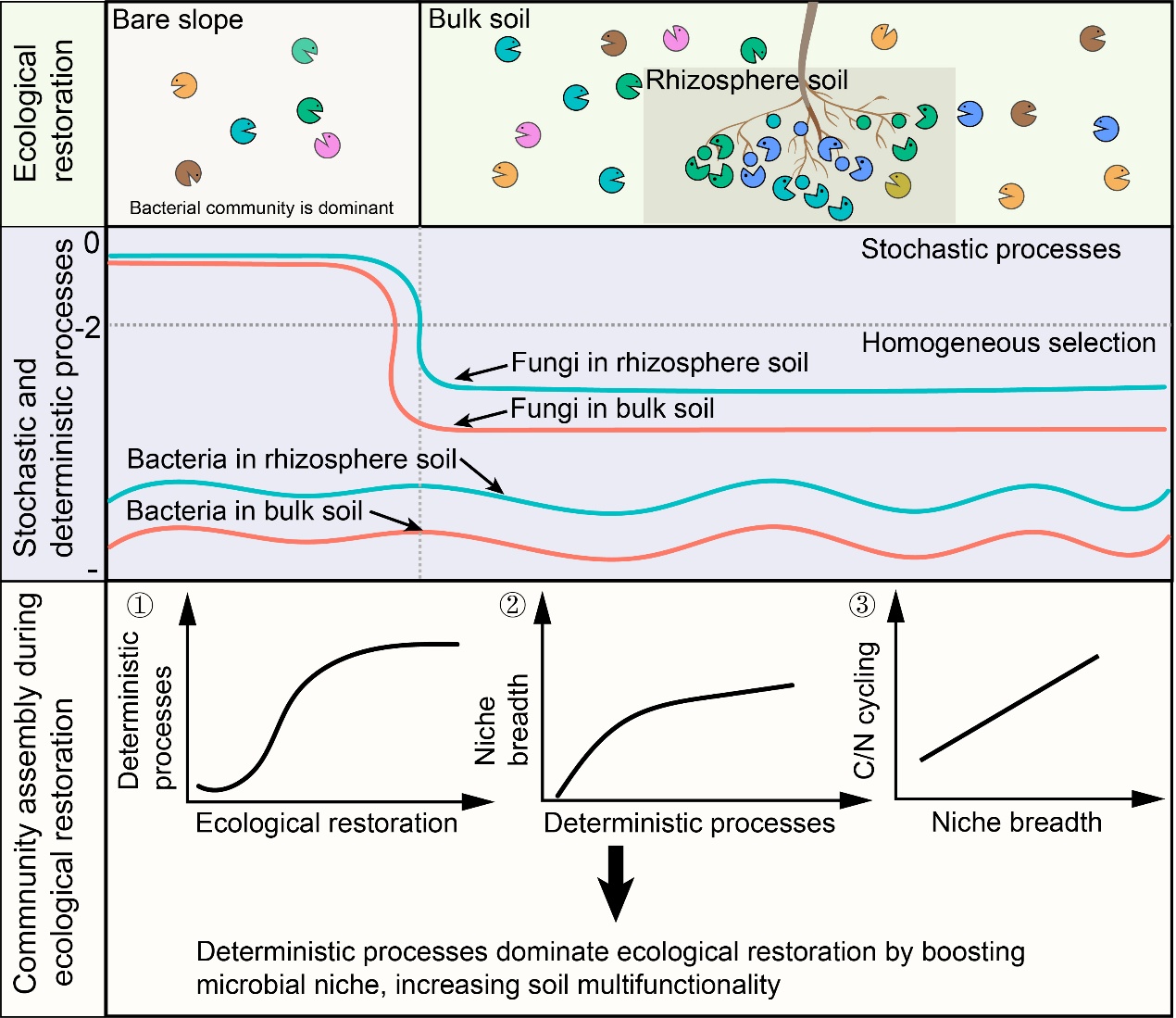 生态修复是应对工程活动引发的生态系统退化、提升生态系统多功能性的关键手段,尤其在生态脆弱、养分贫瘠的高寒地区具有重大意义。土壤微生物群落作为陆地生态系统的“隐形工程师”,在调控生物地球化学循环、植物—土壤反馈及生境稳定性方面发挥着不可替代的作用,是实现生态系统功能恢复的重要驱动力。尽管已有大量研究关注微生物多样性及其网络结构对生态系统功能的影响,但在生态恢复过程中,微生物群落的构建机制——即随机性过程(如生态漂变)与确定性过程(如环境过滤)的相对作用——仍不明确。