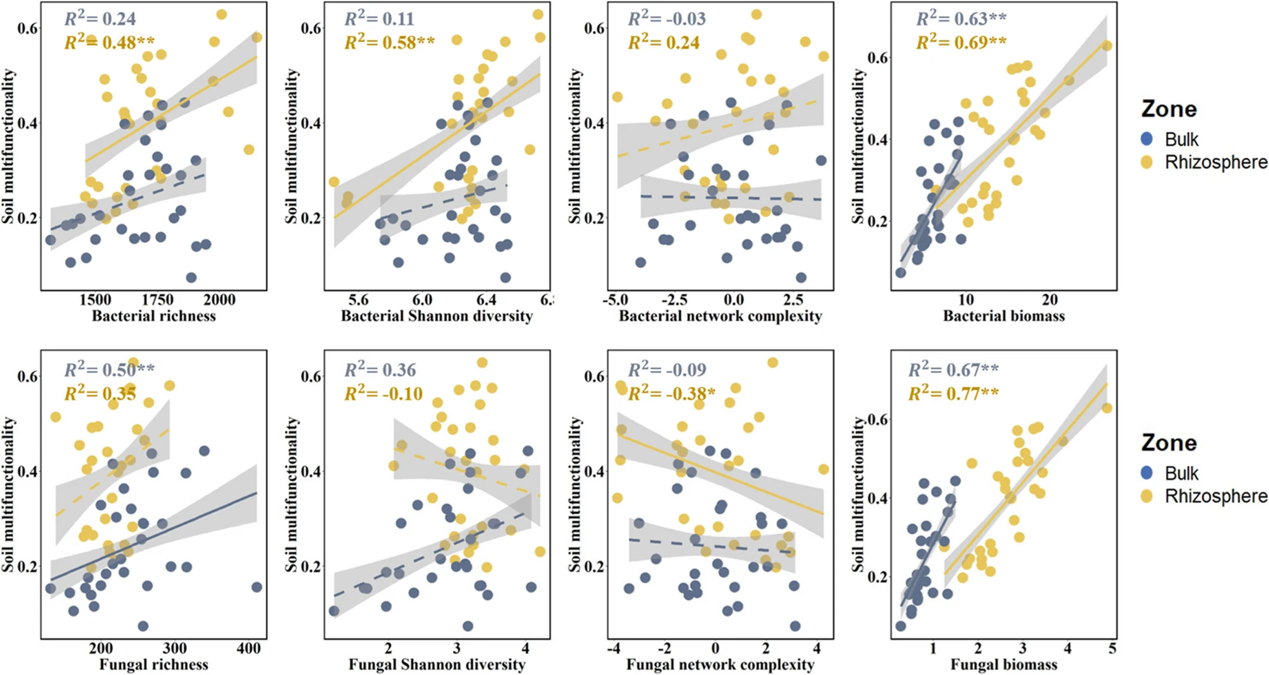 根际是受植物根系显著调控的微域环境,也是土壤微生物聚集及其功能表达的关键区域。近年来,土壤微生物多样性与生态系统多功能性之间的关联已成为地下生态学研究的重要议题。然而,现有研究多聚焦于非根际土壤,对根际与非根际土壤在多功能性方面的系统比较仍较为缺乏。此外,微生物群落是否以及如何在根际与非根际中驱动土壤多功能性,其具体机制尚不明确。上述局限制约了我们对生态系统功能整体格局及其调控机制的深入理解。