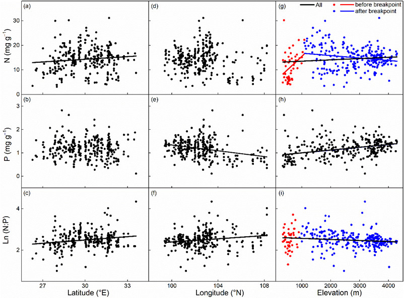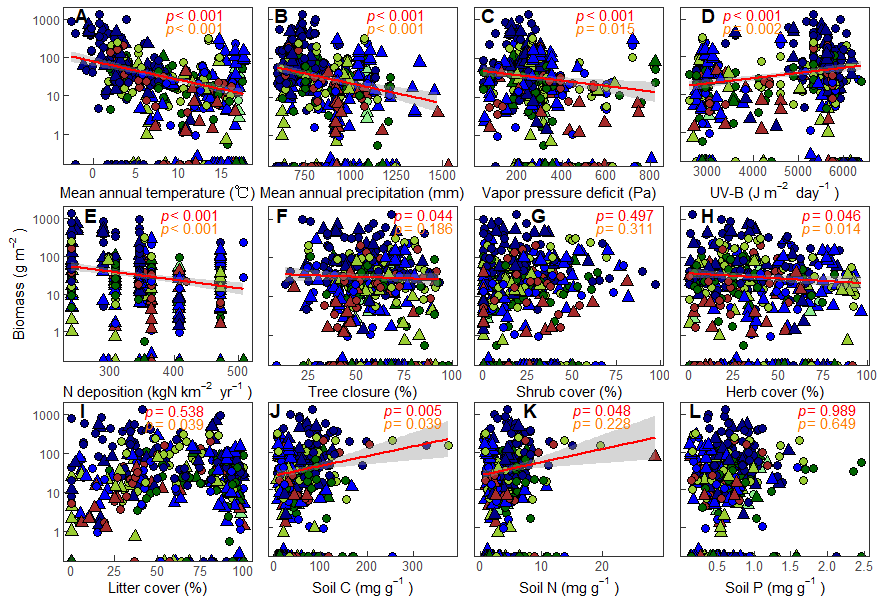 对295个森林样点的研究表明,苔藓植物N、P含量总体随海拔升高(年均温降低)呈上升趋势,但具体格局取决于研究尺度与范围 (Wang et al.,2022)。进一步分析显示,苔藓植物的N、P含量与土壤养分密切相关,其中P含量还与年降水量及灌木、草本盖度负相关;相比之下,土壤养分和温度对苔藓植物N、P含量的影响明显大于降水和上层植被盖度。