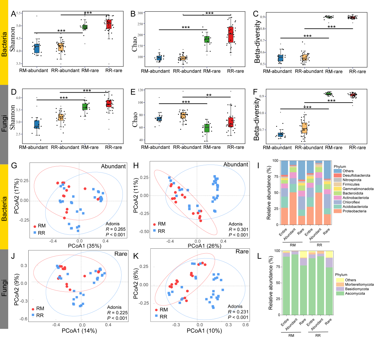 图1水稻单作和轮作系统中微生物丰富和稀有类群的多样性群落组成特征