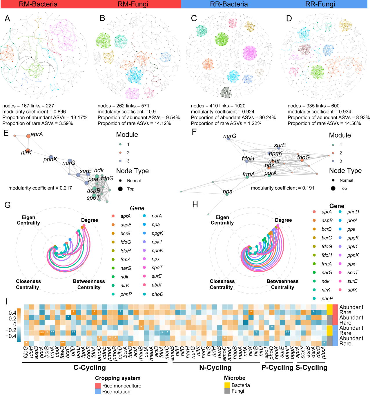 图2水稻单作和轮作系统的微生物和功能基因网络及其相互作用