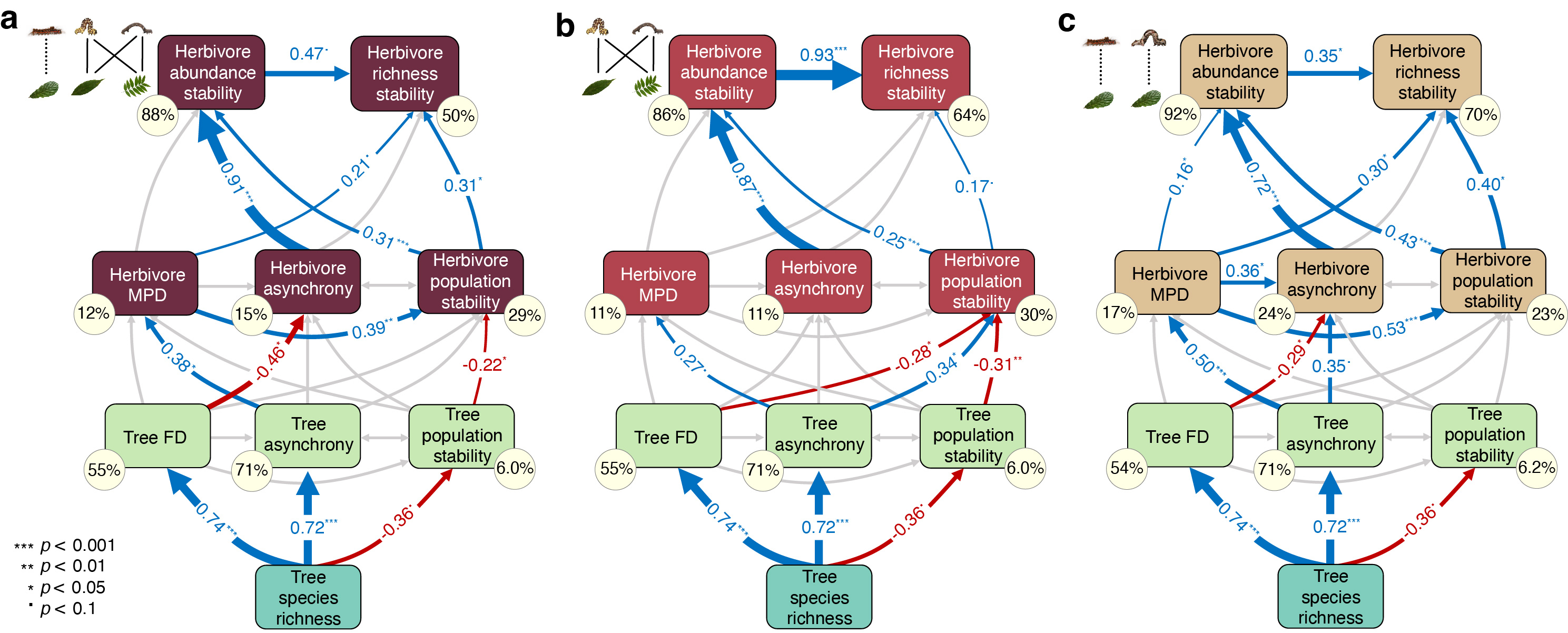 图3 基于结构方程模型的树种多样性对植食性昆虫群落稳定性的自下而上调控效应