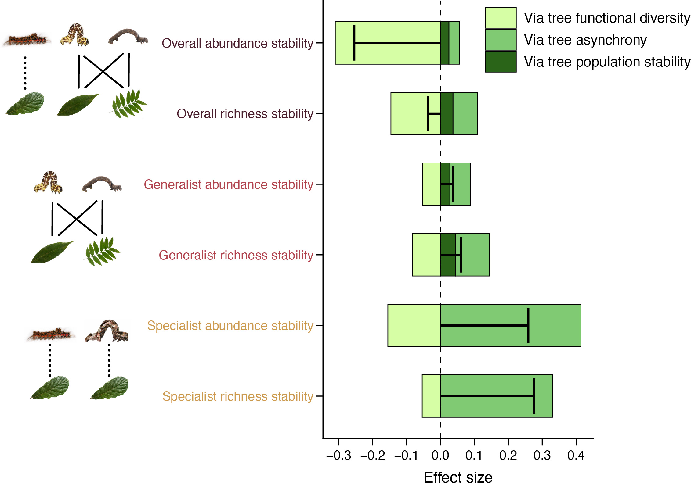 3.树种多样性对专食性和广食性昆虫的稳定性效应存在显著差异(图2b–f,图3)。