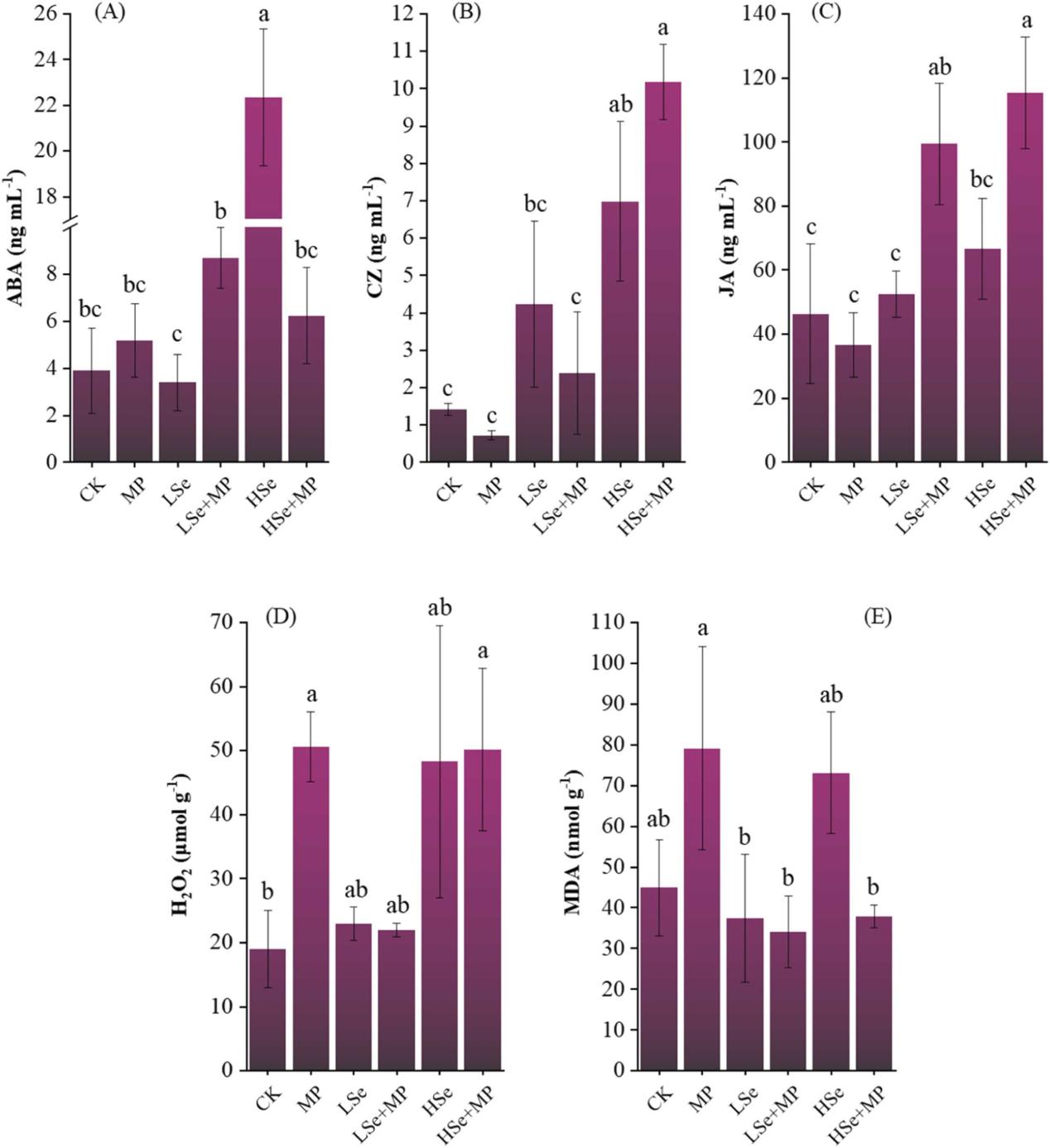 图2 MP和Se处理对植物激素及氧化应激标志物的影响