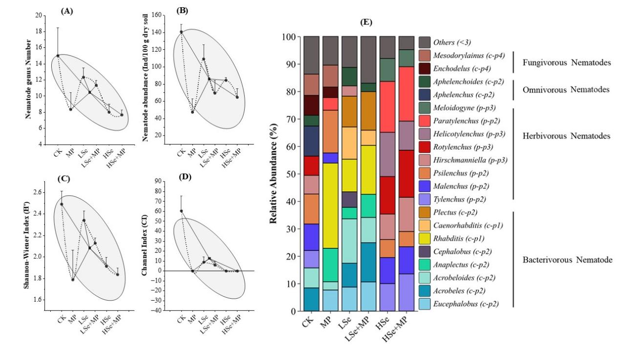 微塑料(MP)作为土壤生态系统的新兴污染物,可通过破坏土壤理化性质、降低生物多样性、抑制植物生理功能等途径,威胁农田生态系统健康、作物生产力及食品安全。尽管针对这种新型污染物对土壤线虫及植物的有害影响已有广泛的研究,但关于如何减轻MP造成的损害的研究仍较为有限。线虫广泛分布于土壤、淡水、海水及动植物体内,线虫在生态系统中通过摄食微生物调节分解过程,促进土壤有机质分解和养分循环,同时作为其他较大动物的基本食物来源,在生态系统的食物链中占据重要地位,被誉为土壤碳氮循环的隐形操控者,对稳定作物生产力具有重要作用。硒(Selenium, Se)作为动植物必需的微量元素,虽被证实能通过调节植物光合作用、抗氧化系统及激素信号通路来缓解植物地上部分的非生物胁迫,但关于其在缓解微塑料诱导的植物损伤及其在土壤-植物互作中的潜在作用,特别是对土壤线虫这一关键生物类群的调控机制,目前仍知之甚少。