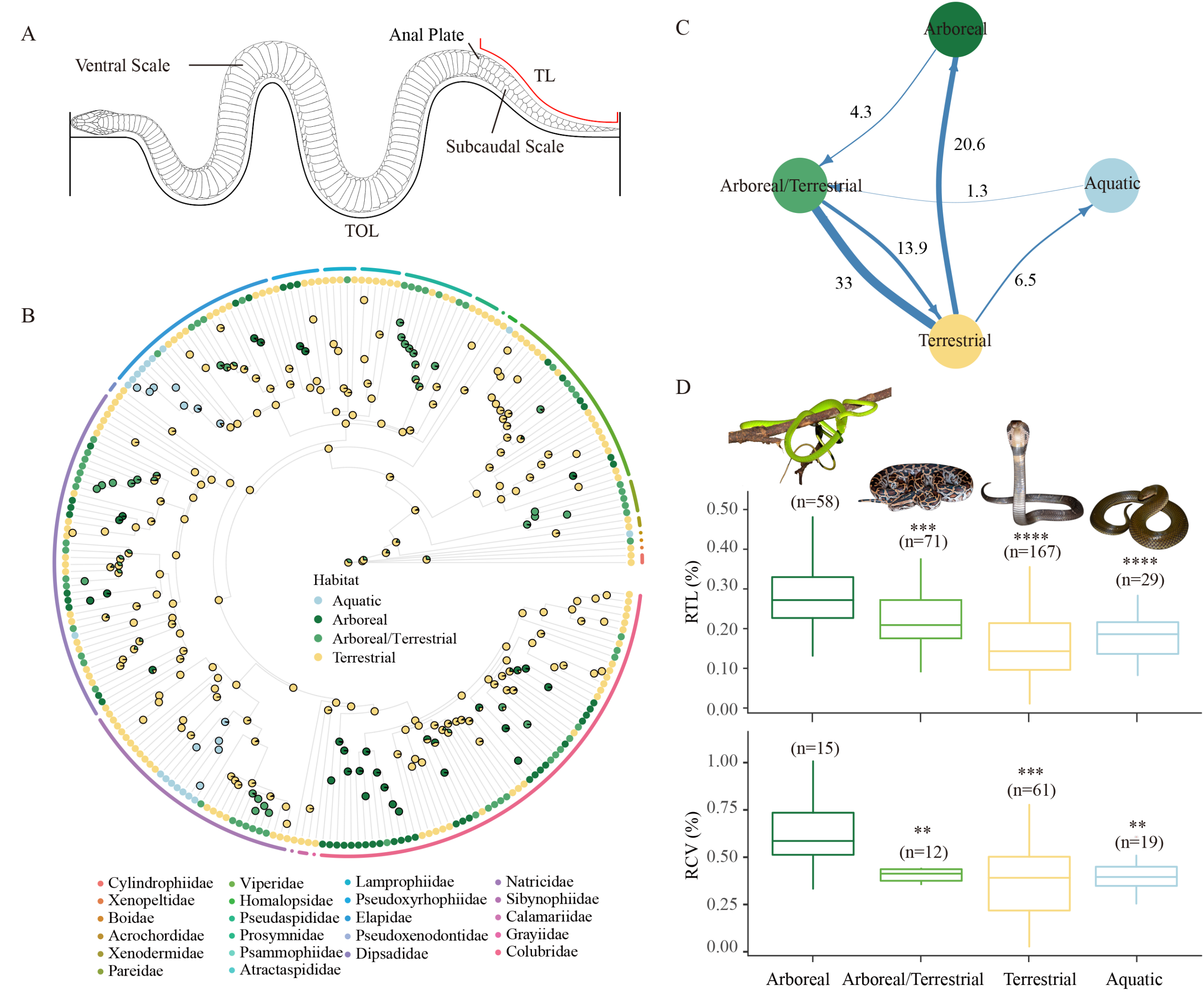 研究系统测定了覆盖15个科、110种蛇类的形态学数据,并采集了各类群对应的生态型信息。祖先性状重建结果显示,蛇类由陆栖祖先演化而来,并向树栖生态位发生了多次独立的适应性演化。形态比较进一步表明,树栖蛇类具有显著更长的相对尾长和更多的尾椎数,提示尾部延长与树栖生活方式的适应密切相关(图1)。
