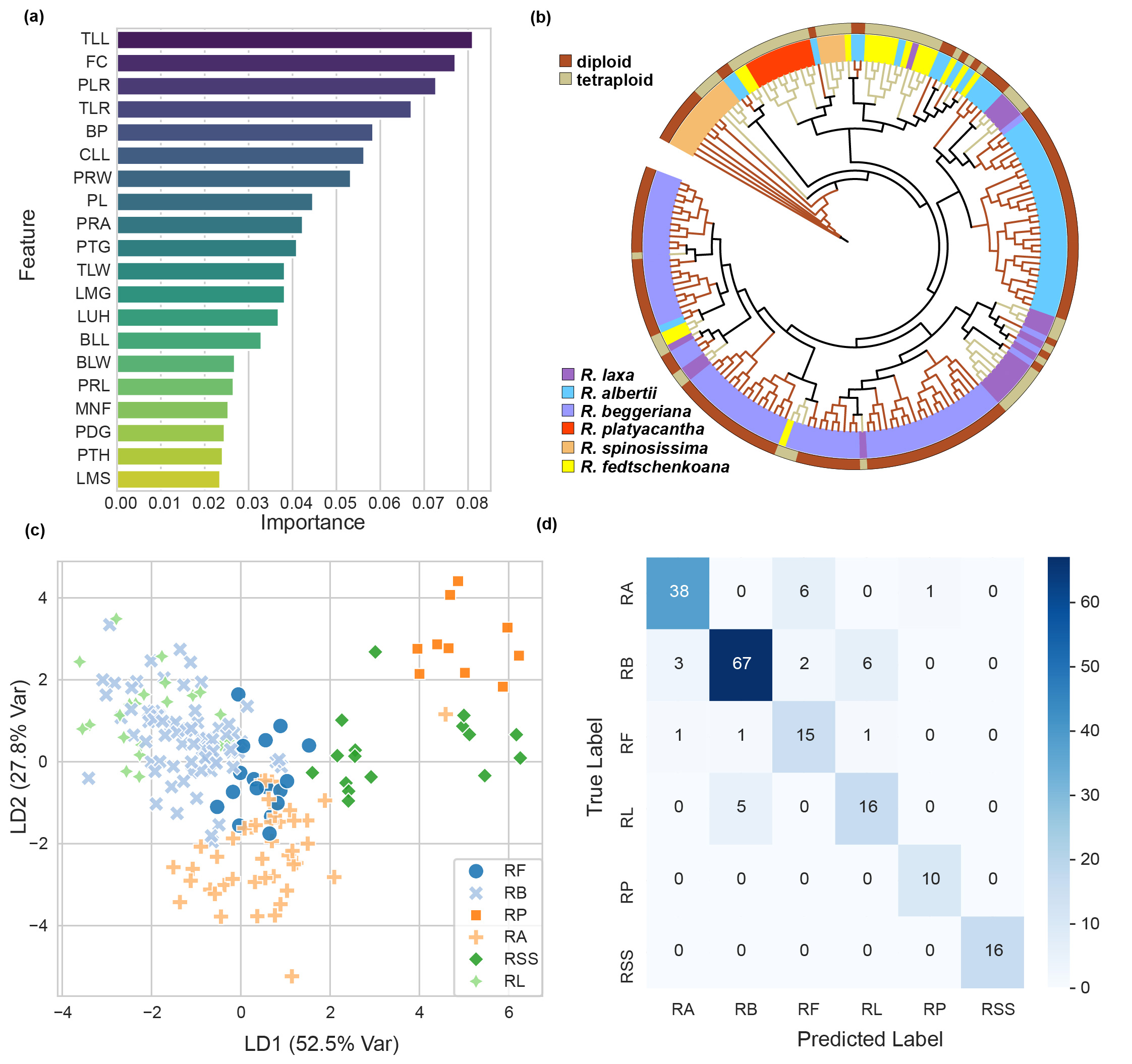 在形态学方面,研究团队对多项定量性状进行统计分析,并整合定性与定量特征构建综合形态距离。结果显示,基于定量性状的PCA降维分析中,不同类群在形态空间重叠明显;而整合定性与定量性状的层次聚类可较好解析物种及谱系分组,且与核系统发育关系表现出较强一致性。进一步引入有监督机器学习筛选诊断性状组合,可显著提升类群判别能力(总体准确率达86.2%),为复杂类群的野外鉴定与标本复核提供了更可操作的性状依据。