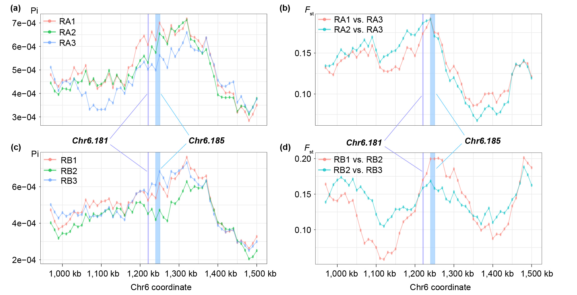 图三 潜在适应性位点的核苷酸多样性与群体分化