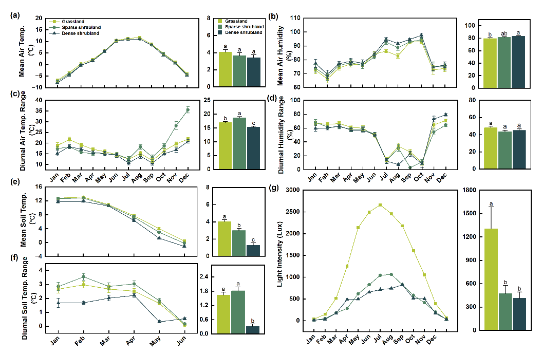 研究发现:(1)灌丛对建群树种早期生活史的促进效应显著,且密灌丛效果优于疏灌丛。相比草地,密灌丛中两种树种萌发率、初期存活率、定植率分别平均提升21%、59.29%和35.97%。(2)密灌丛通过降低光照强度、增加空气湿度,为种子萌发和幼苗生长创造了更温和的微环境。(3)值得注意的是,尽管微生物肥料通过改善土壤理化性质促进了种子萌发,但对幼苗定居产生了间接抑制作用。(4)结构方程模型进一步揭示,不同密度灌丛的促进效应独立于已监测的微气候和土壤理化因子,提示可能存在其他未明确的作用途径(如土壤微生物群落或菌根网络)。