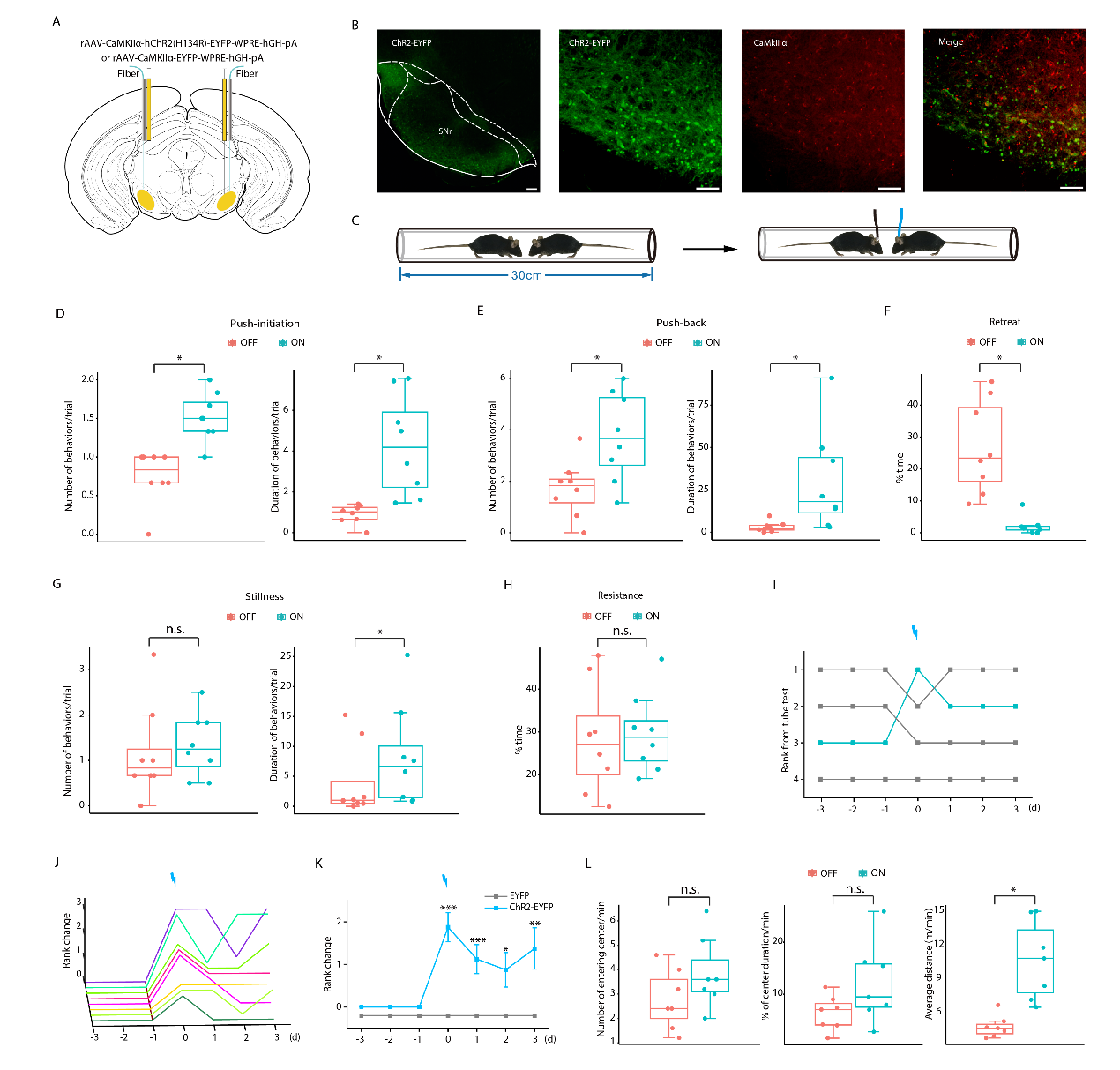 图2. 光遗传激活SNrGlu神经元导致小鼠社会等级上升