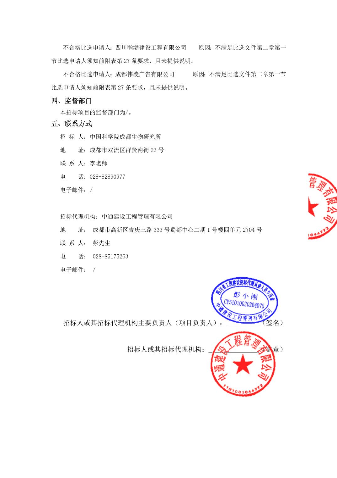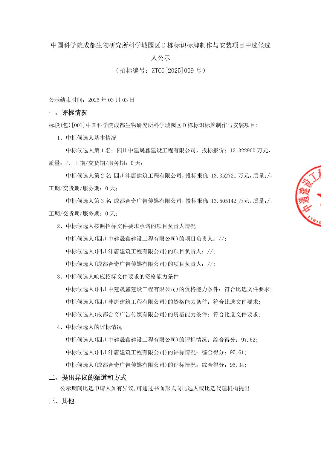 中国科学院成都生物研究所科学城园区D栋标识标牌制作与安装项目中选候选人公示