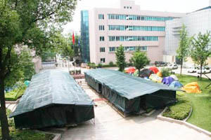 地震当晚,学生全部被统一安排到所内空地和各大楼大厅住宿,抗震救灾值班室通宵安排了值班和巡逻。所领导和人教处的老师们不断安抚学生情绪,稳定学生思想,始终在第一线和同学们在一起。为了更好地解决学生的安全住宿问题,我所专门为学生搭建固定地震篷,以保证学生的生活和学习不受影响。为了让学生及时全面了解全国人民万众一心抗震救灾的情况,所里安装了电视,还专门购买了食品、饮料和药品,为每一位学生发放生活补助金,确保他们的生活不受影响。