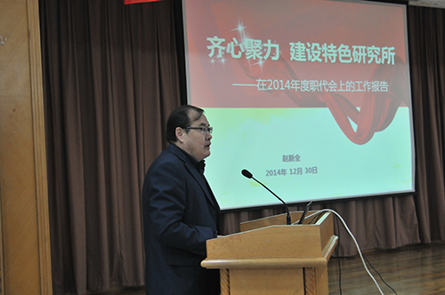 成都生物所所长赵新全代表所务委员会以《齐心聚力 建设特色研究所》通报了2014年研究所主要工作进展。他表示2014年研究所所取得的成绩,和全所职工共同努力密不可分,并向大家表示感谢。报告中,他详细陈述了关于特色研究所建设基本设想,通过分析研究所在服务社会和科学领域地位方面的现状,结合研究所“一三五”规划,明确提出研究所的发展方向,并提请职代会重点讨论。他希望全体职工积极献计献策、奋发图强,为早日将成都生物所建成特色研究所努力奋斗。随后职工代表分为二组,就赵新全的报告进行了重点讨论。