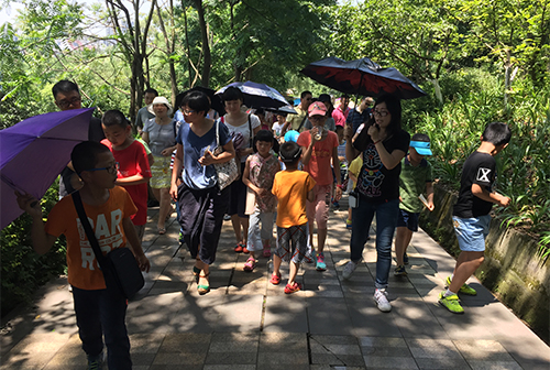 下午2:00,活动准时开始。成都生物所志愿者带领26组家庭由规划线路来到活动地点。一路上,志愿者就地取材,为大家介绍了银杏、梧桐、鹅掌楸等造型各异、各具特点的叶片。志愿者还从叶片的功能、颜色和形态进行了有趣的解读,小朋友也不惧炎热的天气,争相提问,活动气氛十分热烈。