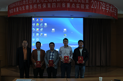 会议还现场评选出了实验室2016年重要贡献奖励共五项。吴彦研究员的咨询报告“聚焦精准扶贫、助推农业发展”和江建平研究员的“ 西藏自治区生物多样性保护战略与行动计划(2013-2030年)”分别获得二等奖;尹华军、陈槐研究员获得的中国科学院青年拔尖人才项目资助,孙庚研究员发表在Science advances的论文“Tree growth acceleration and expansion of alpine forests: The synergistic effect of atmospheric and edaphic change”,以及3个通过省审定的小麦品种(王涛的中科麦36、余懋群的科成麦4号、吴瑜的川育25分别获得三等奖。实验室学术委员会主任于贵瑞、副主任赵新全分别为获奖人员颁发奖励证书。