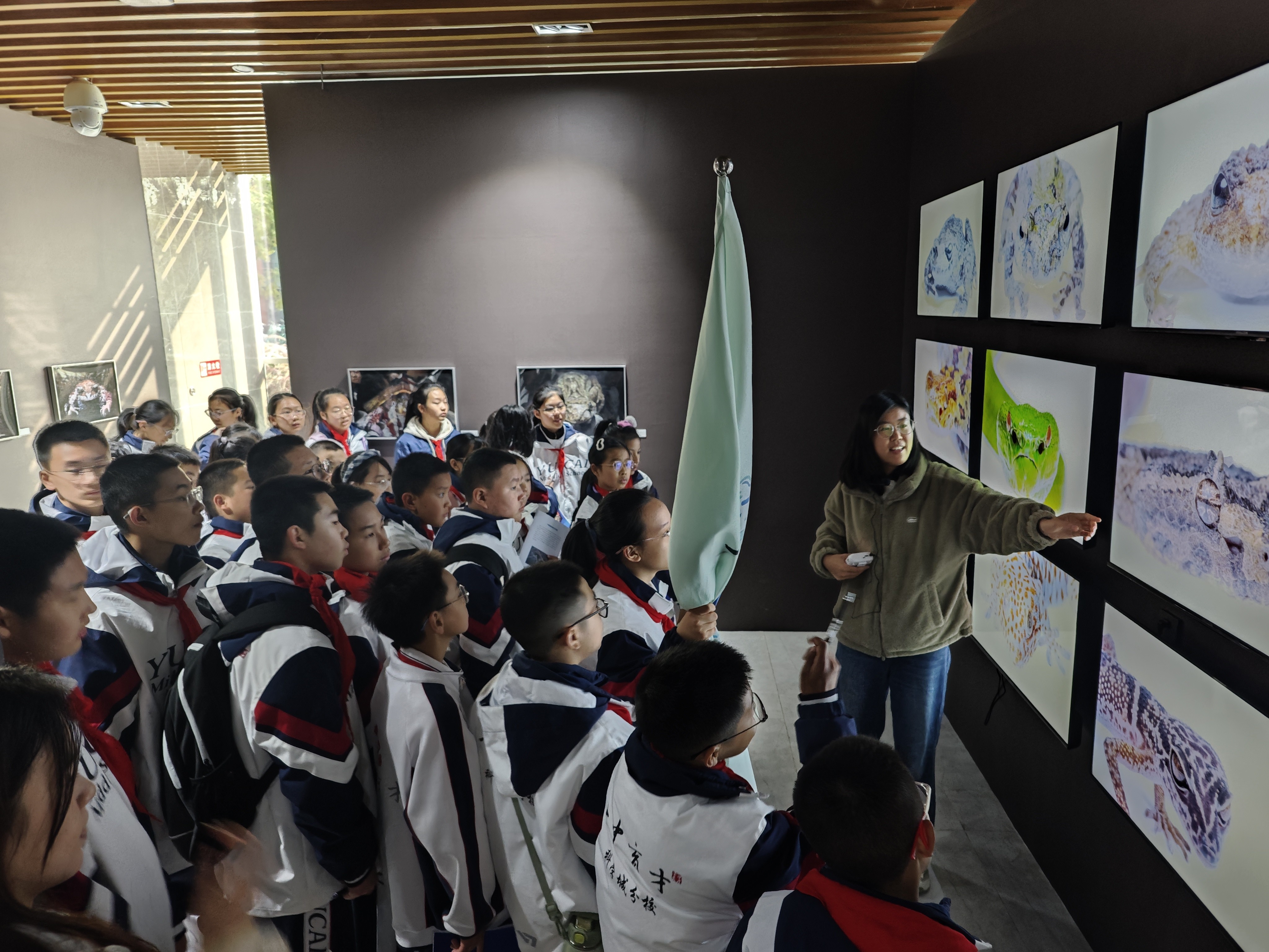 两栖爬行动物特展全方位展示了两栖爬行动物领域的知识与魅力。同学们不仅通过实体标本和多维影像获得了多视角观察体验,更在活体动物体验区与“鬃狮蜥”和“玉米蛇”进行近距离接触。丰富的展区内容和新颖的互动形式,极大地激发了来访者对两栖爬行动物世界的探索兴趣。