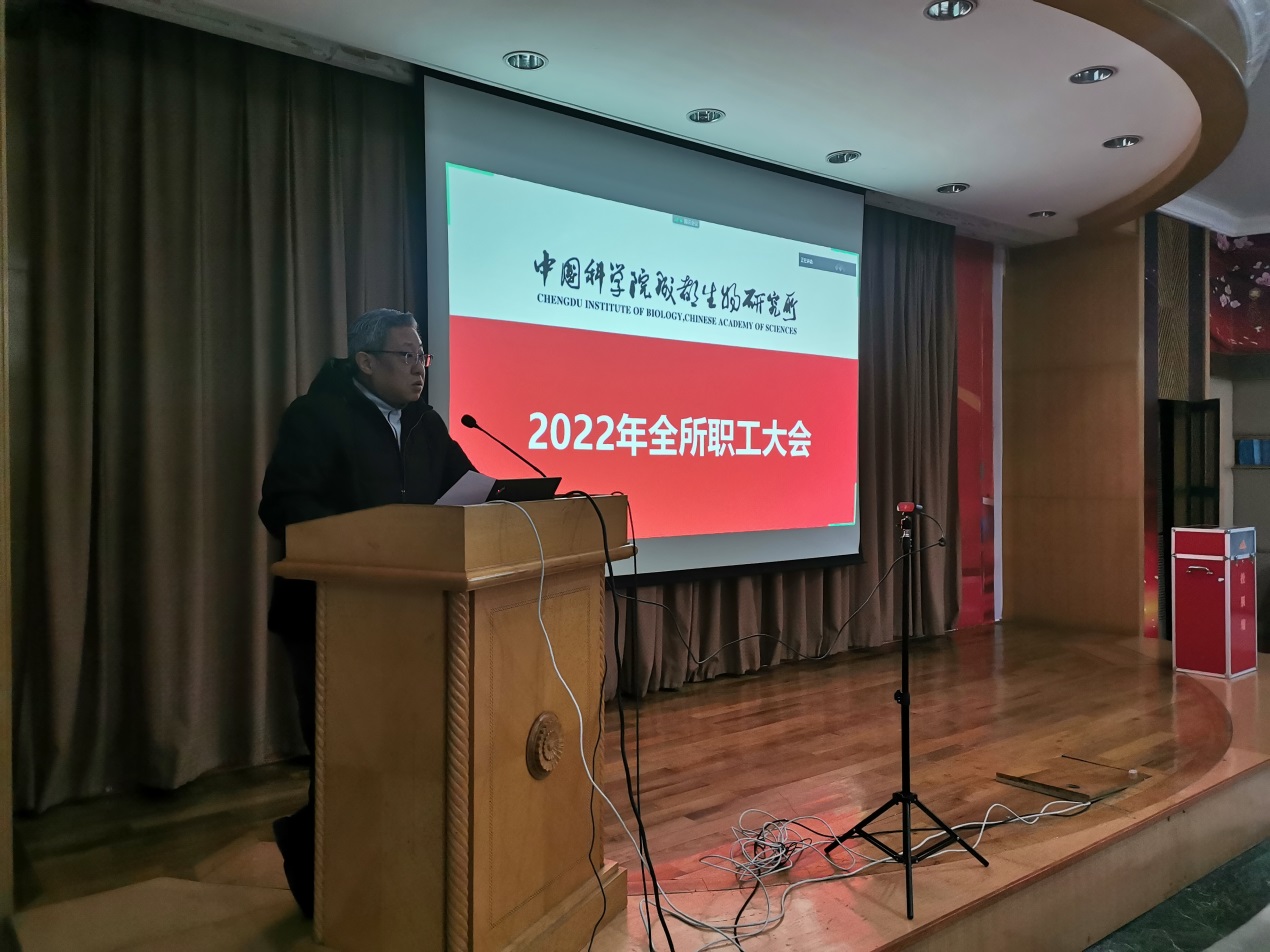 1月14日上午,中国科学院成都生物研究所召开2022年度职工大会,本次会议分为现场会和视频会同步进行。所长吴宁代表所领导班子向全所职工作报告,党委书记、副所长叶彦主持会议。