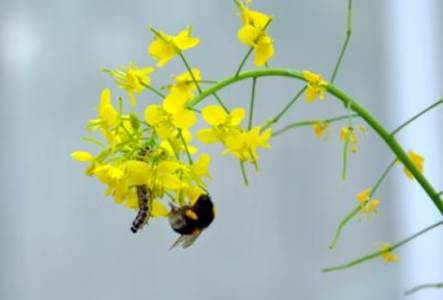 This is a turnip rape with pollinating bumblebee and caterpillar