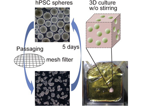 Abstract Utilizing human pluripotent stem cells (hPSCs) in cell-based therapy and drug discovery requires large-scale cell production. However, scaling up conventional adherent cultures presents challenges of maintaining a uniform high quality at low cost. In this regard, suspension cultures are a viable alternative, because they are scalable and do not require adhesion surfaces. 3D culture systems such as bioreactors can be exploited for large-scale production. However, the limitations of current suspension culture methods include spontaneous fusion between cell aggregates and suboptimal passaging methods by dissociation and reaggregation. 3D culture systems that dynamically stir carrier beads or cell aggregates should be refined to reduce shearing forces that damage hPSCs. Here, we report a simple 3D sphere culture system that incorporates mechanical passaging and functional polymers. This setup resolves major problems associated with suspension culture methods and dynamic stirring systems and may be optimal for applications involving large-scale hPSC production.