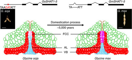 王印政团队针对栽培大豆果实裂荚抗性这一关键驯化性状展开了全面而深入的研究。结果发现,野大豆果实腹缝线处的纤维帽细胞具有关键作用。当果实成熟时,这些细胞随之破裂,使两个果瓣裂开。而栽培大豆中,纤维帽细胞有6~8层并且细胞壁剧烈加厚。当果实成熟时,酶的分解和机械张力都很难使这些细胞破裂,两个果瓣也就不会在自然状况下裂开。