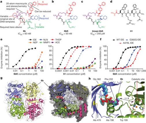 Abstract Despite decades of speculation that inhibiting endogenous insulin degradation might treat type-2 diabetes1, 2, and the identification of IDE (insulin-degrading enzyme) as a diabetes susceptibility gene3, 4, the relationship between the activity of the zinc metalloprotein IDE and glucose homeostasis remains unclear. Although Ide–/– mice have elevated insulin levels, they exhibit impaired, rather than improved, glucose tolerance that may arise from compensatory insulin signalling dysfunction5, 6. IDE inhibitors that are active in vivo are therefore needed to elucidate IDE’s physiological roles and to determine its potential to serve as a target for the treatment of diabetes. Here we report the discovery of a physiologically active IDE inhibitor identified from a DNA-templated macrocycle library. An X-ray structure of the macrocycle bound to IDE reveals that it engages a binding pocket away from the catalytic site, which explains its remarkable selectivity. Treatment of lean and obese mice with this inhibitor shows that IDE regulates the abundance and signalling of glucagon and amylin, in addition to that of insulin. Under physiological conditions that augment insulin and amylin levels, such as oral glucose administration, acute IDE inhibition leads to substantially improved glucose tolerance and slower gastric emptying. These findings demonstrate the feasibility of modulating IDE activity as a new therapeutic strategy to treat type-2 diabetes and expand our understanding of the roles of IDE in glucose and hormone regulation.