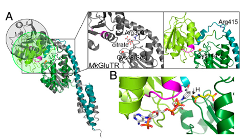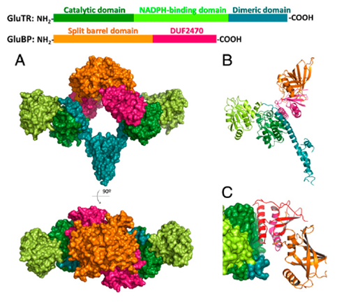中科院植物所光生物学重点实验室刘琳研究组日前解析了拟南芥的谷氨酰-tRNA还原酶(GluTR)与其结合蛋白的复合物晶体结构。该结构中GluTR处于活性状态,反应的产物释放通道在结构中得到清楚的展现。实验分析发现,GluTR的活性受到其结合蛋白的正调控。