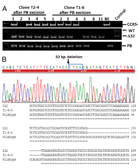 Abstract Individuals homozygous for the C-C chemokine receptor type 5 gene with 32-bp deletions (CCR5Δ32) are resistant to HIV-1 infection. In this study, we generated induced pluripotent stem cells (iPSCs) homozygous for the naturally occurring CCR5Δ32 mutation through genome editing of wild-type iPSCs using a combination of transcription activator-like effector nucleases (TALENs) or RNA-guided clustered regularly interspaced short palindromic repeats (CRISPR)-Cas9 together with the piggyBac technology. Remarkably, TALENs or CRISPR-Cas9–mediated double-strand DNA breaks resulted in up to 100% targeting of the colonies on one allele of which biallelic targeting occurred at an average of 14% with TALENs and 33% with CRISPR. Excision of the piggyBac using transposase seamlessly reproduced exactly the naturally occurring CCR5Δ32 mutation without detectable exogenous sequences. We differentiated these modified iPSCs into monocytes/macrophages and demonstrated their resistance to HIV-1 challenge. We propose that this strategy may provide an approach toward a functional cure of HIV-1 infection.