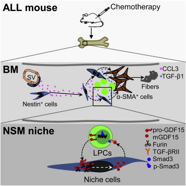 研究人员先将人急性淋巴细胞白血病细胞注入小鼠体内,建立白血病小鼠模型,之后给予化疗,用先进的成像技术等进行观察和研究。发现白血病细胞在骨髓中浸润性生长,在实质性破坏正常骨髓微环境后,给予化疗,白血病干细胞会分泌一些细胞因子,招募和改造骨髓间充质干细胞,建立一个临时的“庇护所”,逃避化疗杀伤。正如地震摧毁了房屋,幸存者搭建一个临时帐篷,度过灾难期。