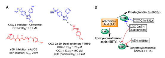 COX和sHE酶可控制脂质信号转导,长期以来脂质信号都与炎症、细胞迁移、增殖、高血压和其他过程有关。COX抑制剂可阻断炎性和疼痛诱导脂质的产生,而sHE抑制剂是降压、抗炎和镇痛化合物。以前研究人员发现,COX和sHE抑制剂共同使用可减少炎症和神经性疼痛。