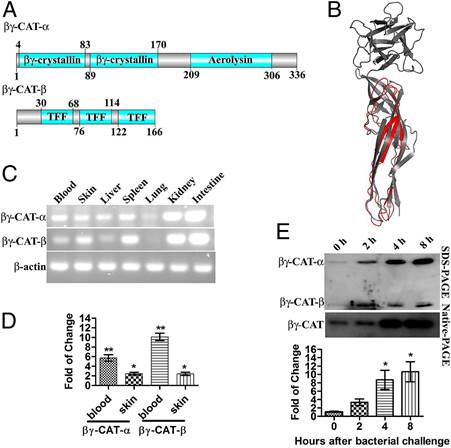 张云等从两栖动物大蹼铃蟾中分离和克隆出betagamma-CAT,并发现该蛋白质复合物的表达调控与微生物感染密切相关。betagamma-CAT的作用机制在于通过宿主细胞受体介导的该蛋白复合物内吞,溶酶体膜寡聚化和通道形成,造成细胞炎症小体的激活,从而迅速有效地激发体内天然免疫响应清除体内微生物的感染。
