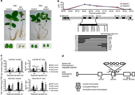 盐化作用对于农业构成了严重的威胁,影响全球20%灌溉地作物的收成。在盐胁迫条件下,野生大豆表现出很高的耐受性,因此对于提高大豆的耐盐性改良而言,野生大豆拥有非常好的遗传资源。研究人员还发现拥有完整耐盐基因序列是大豆祖先共有的特征,对盐比较敏感的栽培大豆的后代积累了不同类型的基因突变。这些变异导致耐盐基因功能异常或者低表达。
