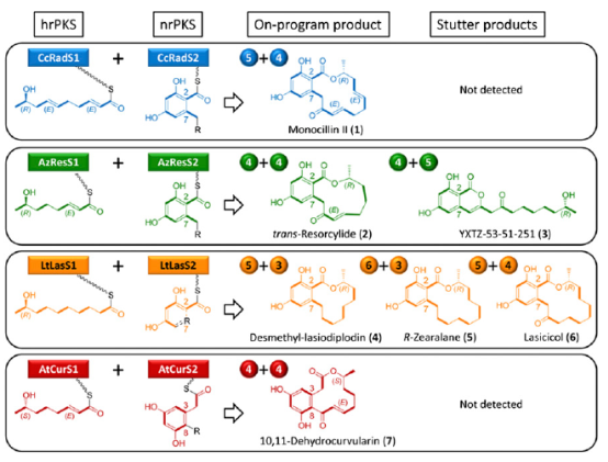 组合生物合成技术,是近年发展起来的一种扩展天然产物结构多样性、形成新的生物合成途径,从而产生非天然化合物的新方法。中国农科院生物技术研究所研究员林敏科研团队与美国亚利桑那大学自然资源和环境学院教授莫尔纳(Molnar)科研团队,针对目前已经研究清楚的四种天然苯二酚内酯聚酮化合物的模式生物合成途径,利用组合生物合成技术,实现一系列“非天然的”的聚酮类化合物的一步合成,这种“即插即用”的模块化方法,可应用于结构多样的全新化学物质的组合生物合成。