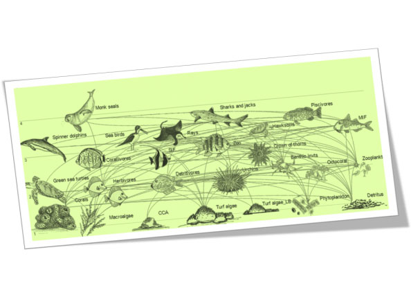 该图描述了一个珊瑚礁生态系统中的生态联系。