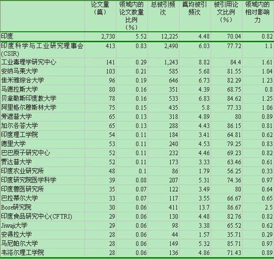 表5 2009~2013年印度毒理学研究机构的论文产出情况