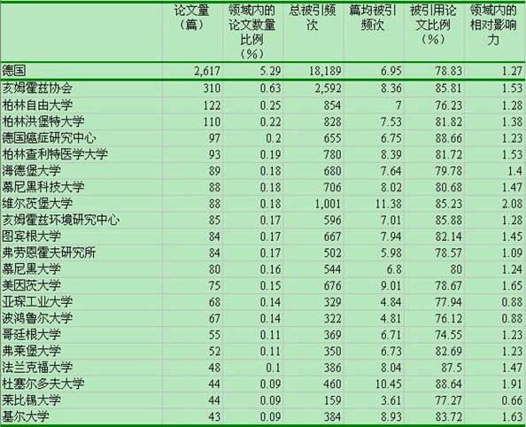 在德国的研究机构(表7)中,亥姆霍兹协会、柏林自由大学、柏林洪堡特大学的研究产出相对较高,而维尔茨堡大学、杜塞尔多夫大学等在论文质量上也具有极高的水平。