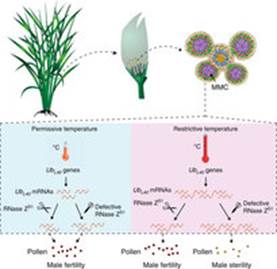tms5是功能缺失的基因,其野生型基因编码了一个短版的RNase Z家族蛋白。该蛋白可降解三个编码泛素与核糖体融合蛋白基因UbL40的mRNA。低温下生长的安农S-1的UbL40 mRNA表达量较低且与野生型类似,因此其花粉育性正常;高温下,野生型水稻中RNase Z能及时降解受温度诱导的UbL40 mRNA,因而维持花粉正常发育;不育系中,受温度诱导的UbL40 mRNA不能被功能缺失的RNase Z及时切割而导致其mRNA积累,进而可能影响细胞内泛素平衡,引发花粉母细胞液泡化,最终导致花粉败育。