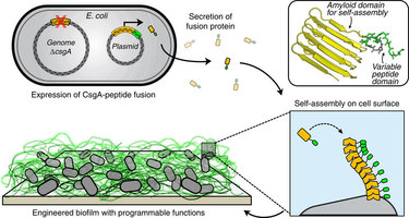 Abstract The significant role of biofilms in pathogenicity has spurred research into preventing their formation and promoting their disruption, resulting in overlooked opportunities to develop biofilms as a synthetic biological platform for self-assembling functional materials. Here we present Biofilm-Integrated Nanofiber Display (BIND) as a strategy for the molecular programming of the bacterial extracellular matrix material by genetically appending peptide domains to the amyloid protein CsgA, the dominant proteinaceous component in Escherichia coli biofilms. These engineered CsgA fusion proteins are successfully secreted and extracellularly self-assemble into amyloid nanofibre networks that retain the functions of the displayed peptide domains. We show the use of BIND to confer diverse artificial functions to the biofilm matrix, such as nanoparticle biotemplating, substrate adhesion, covalent immobilization of proteins or a combination thereof. BIND is a versatile nanobiotechnological platform for developing robust materials with programmable functions, demonstrating the potential of utilizing biofilms as large-scale designable biomaterials.
