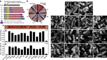 “这种方法用途广泛。”乔希说。他们还证明了能把12种不同的蛋白质融合到CsgA蛋白上,排列方式和长度丰富多样,这意味着至少在理论上,他们能用这种技术来表现任何蛋白质序列——这些蛋白质执行一系列功能:结合外来粒子、实现化学反应、传输信号、提供结构支撑、运输或存储特定分子等等。他们不仅能把这些功能一个一个地设计到生物膜中,还能结合起来产生多功能生物膜。