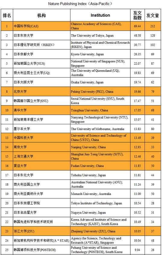 10月20日,自然出版集团(NPG)发布了名为《自然出版指数2013》(Nature Publishing Index 2013)的报告。中国共有16所大学进入亚太区发文前50名,其中中国科学院排名亚太区发文学术机构第一。
