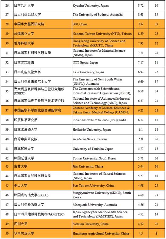 以下为《自然出版指数2013》(Nature Publishing Index 2013)亚太区学术机构发文的前50名。