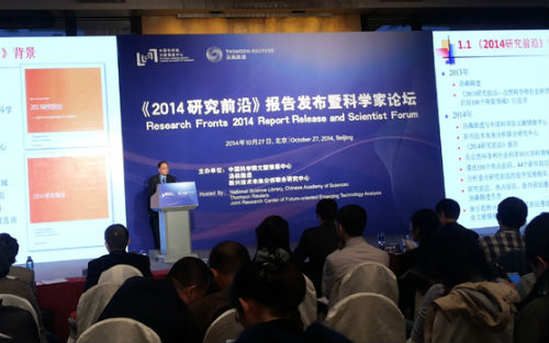 10月27日,中国科学院文献情报中心与汤森路透旗下的知识产权与科技事业部联合举办《2014研究前沿》报告发布暨科学家论坛,共同发布《2014研究前沿》报告,遴选出2014年排名最前的100个热点研究前沿和44个新兴研究前沿。