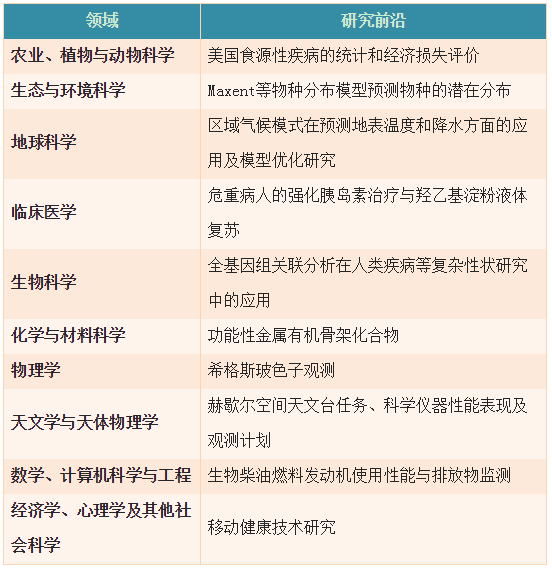 中国科学院文献情报中心与汤森路透联合发布《2014研究前沿》报告,选出2014年排名最前的100个热点研究前沿和44个新兴研究前沿。报告发现,针对Maxent等物种分布模型预测物种的潜在分布、全基因组关联分析、CRISPR/Cas基因组编辑技术、移动健康技术等方面的研究非常活跃。