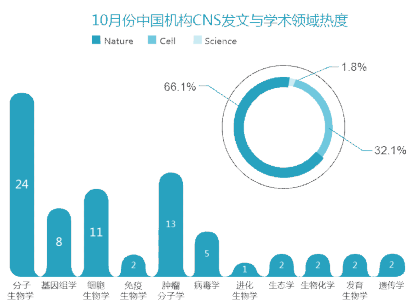 从学科领域上看,10月份,CNS发表的中国机构研究论文中,分子生物学领域(24篇)排在第1位,肿瘤分子学排在第二位,有13篇文章入列,细胞生物学有11篇文章入列,排在第三。