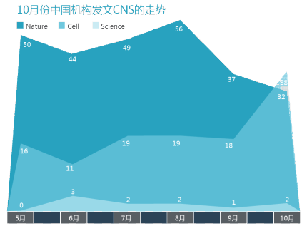 从发文比例上看,与上月相比,本月Cell系列期刊发文数量暴增了20篇;中国机构发表的论文一直处于上位的Nature系列期刊略低于9月;Science系列期刊发文数量为2篇,略高于上月。