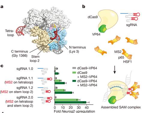 人们过去是将活化结构域连接在Cas9的末端,但效果并不理想。MIT这个团队意识到,RNA从Cas9复合体伸出的两个小环是更好的连接位点,这样活化结构域在招募转录机器时就更加灵活。他们用改造后的CRISPR系统成功激活了十个基因。这些基因的转录都得到了两倍以上的增涨,许多基因的活性甚至有了几个数量级的增加。