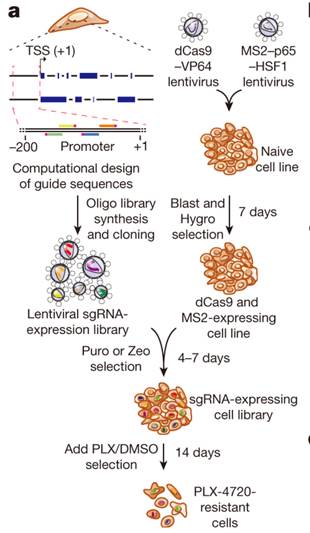 随后,研究人员建立了70,290个引导RNA的文库,来靶标人类基因组超过两万个基因。他们由此鉴定了让黑色素瘤抵抗药物PLX-4720的基因。PLX-4720对于携带BRAF突变的患者疗效比较好,残存下来的癌细胞会长成新的肿瘤,导致癌症复发。