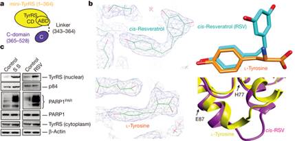 在这项新研究中,Sajish和Schimmel将TyrRS与白藜芦醇放置了在一起,并通过X射线晶体学等试验证实白藜芦醇确实模拟了酪氨酸,其能够紧密地装入到TyrRS的酪氨酸结合口袋中。研究小组发现,TyrRS与白藜芦醇结合会使其脱离蛋白质翻译角色,将其引导到细胞核中发挥功能。